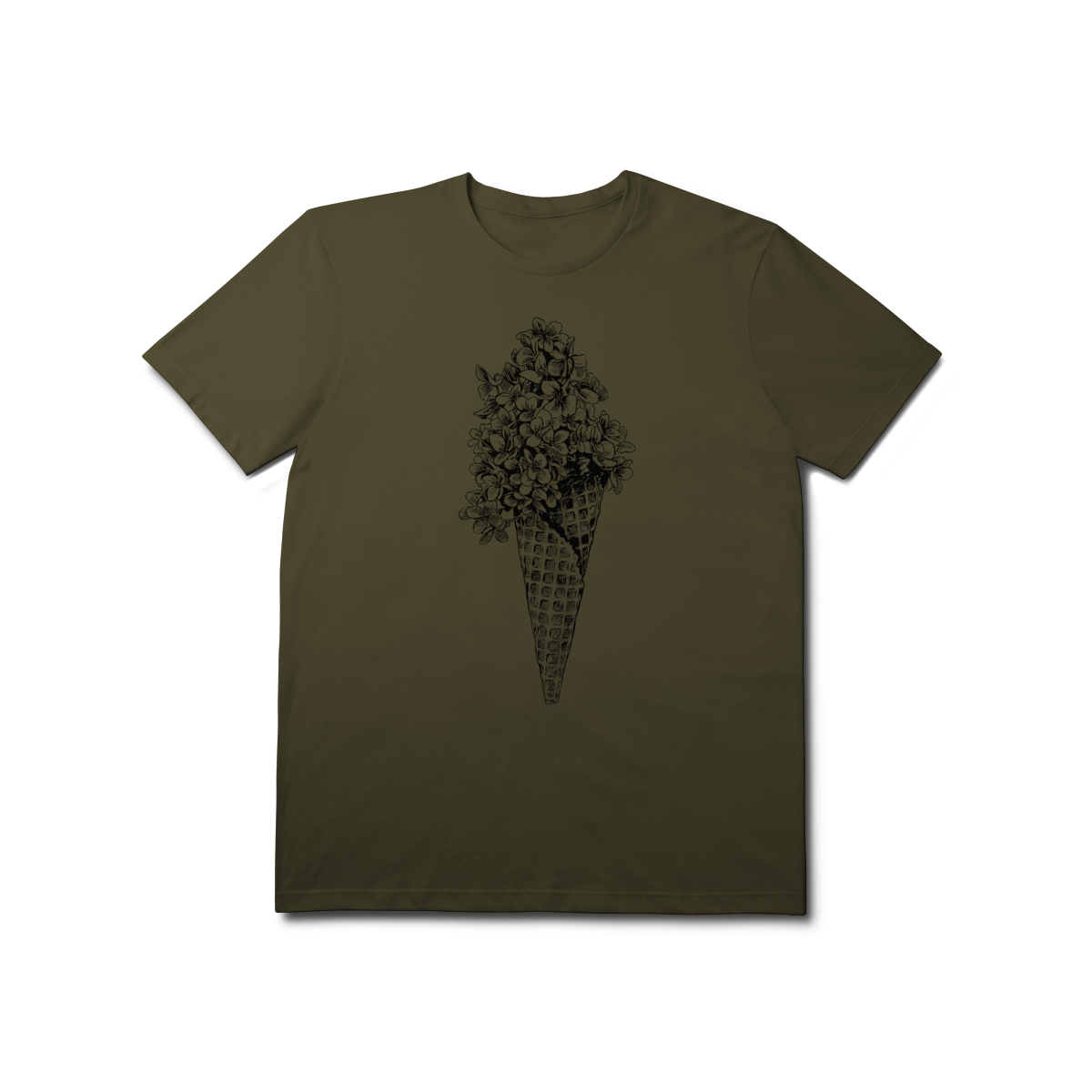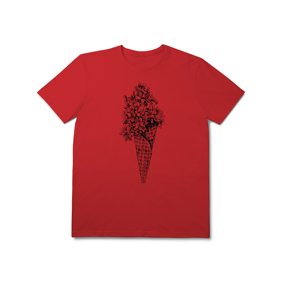Onde o sabor encontra o jardim. Esta estampa exclusiva em preto e branco subverte um ícone do cotidiano: uma casquinha de sorvete clássica que, em vez de esferas geladas, transborda em um arranjo floral detalhado. Com um traço estilo fine line e sombras sutis, a peça explora o conceito de crescimento e doçura em uma composição onírica e minimalista. Ideal para quem busca um visual de fantasia urbana que celebra a natureza de forma inusitada e artística.