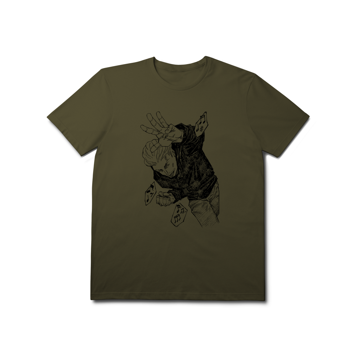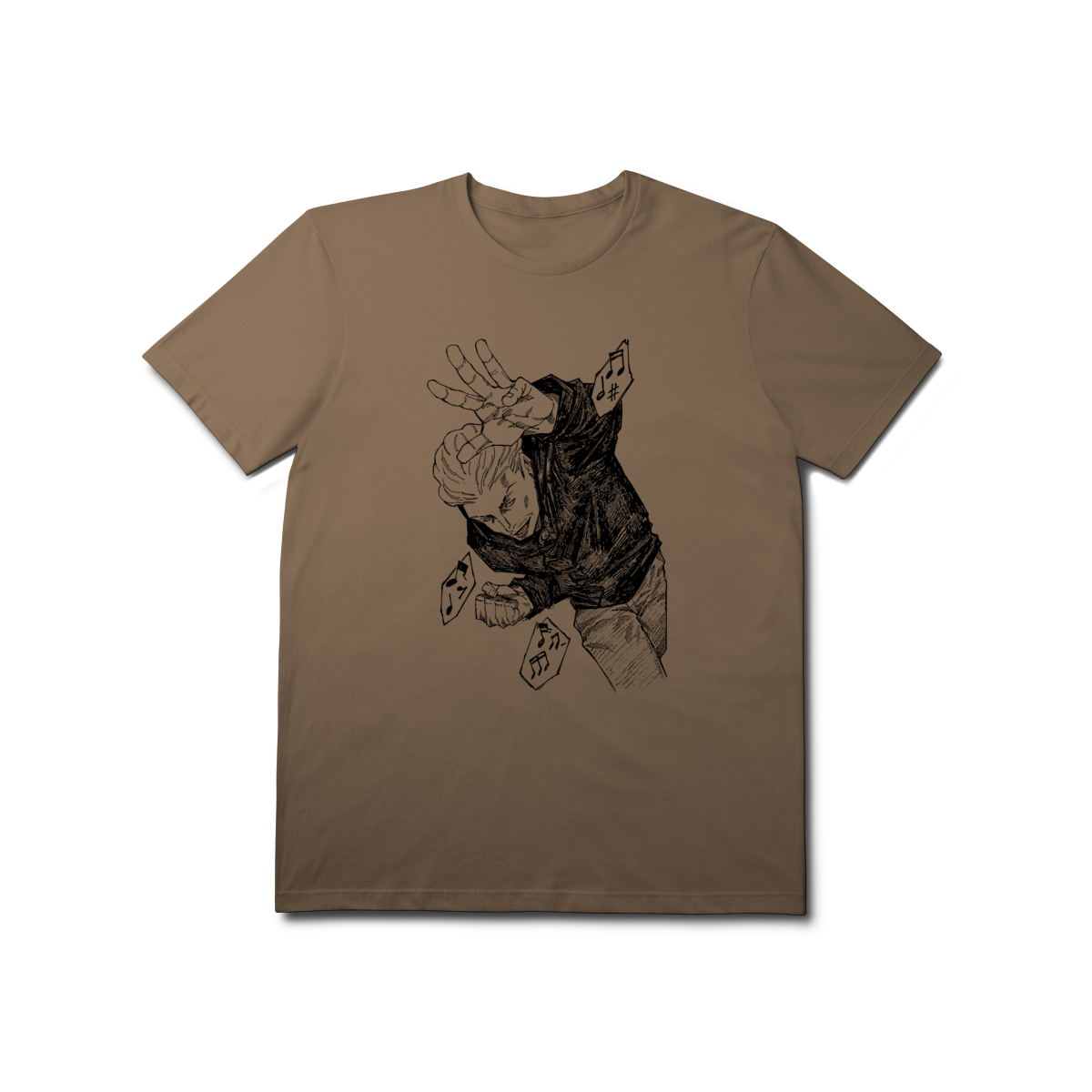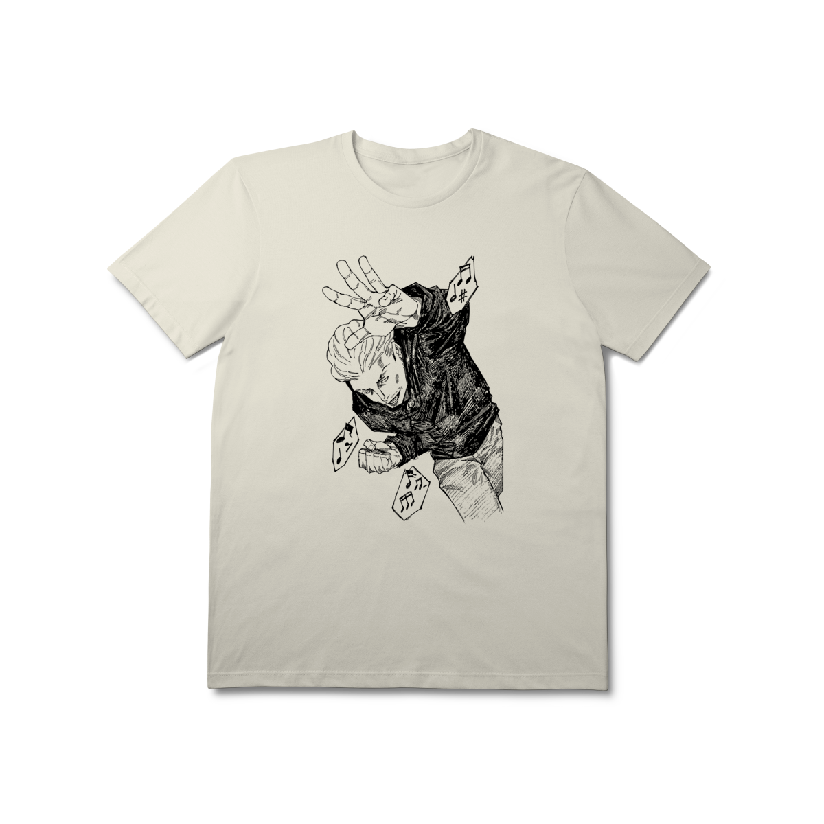 Sinta a vibração do Jackpot. Esta estampa exclusiva em preto e branco traz Kinji Hakari, o mestre da Expansão de Domínio "Idle Death Gamble", em sua pose mais icônica. A arte, em estilo sketch de alto contraste, é adornada por notas musicais e fragmentos que remetem à trilha sonora de sua técnica, capturando o estado de euforia e imortalidade temporária do personagem. Uma peça obrigatória para fãs do mangá que buscam um visual streetwear agressivo e cheio de atitude.