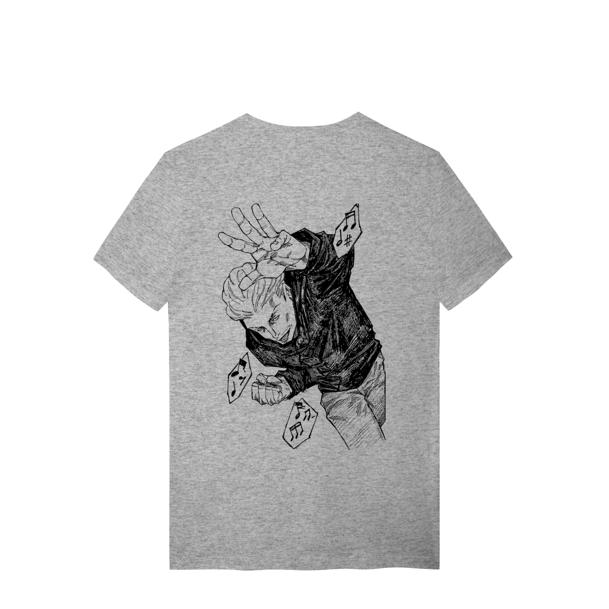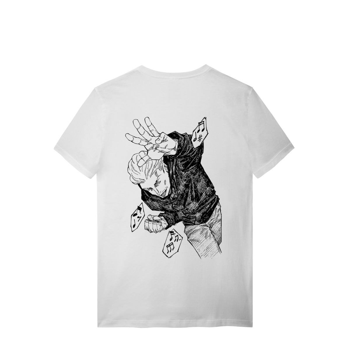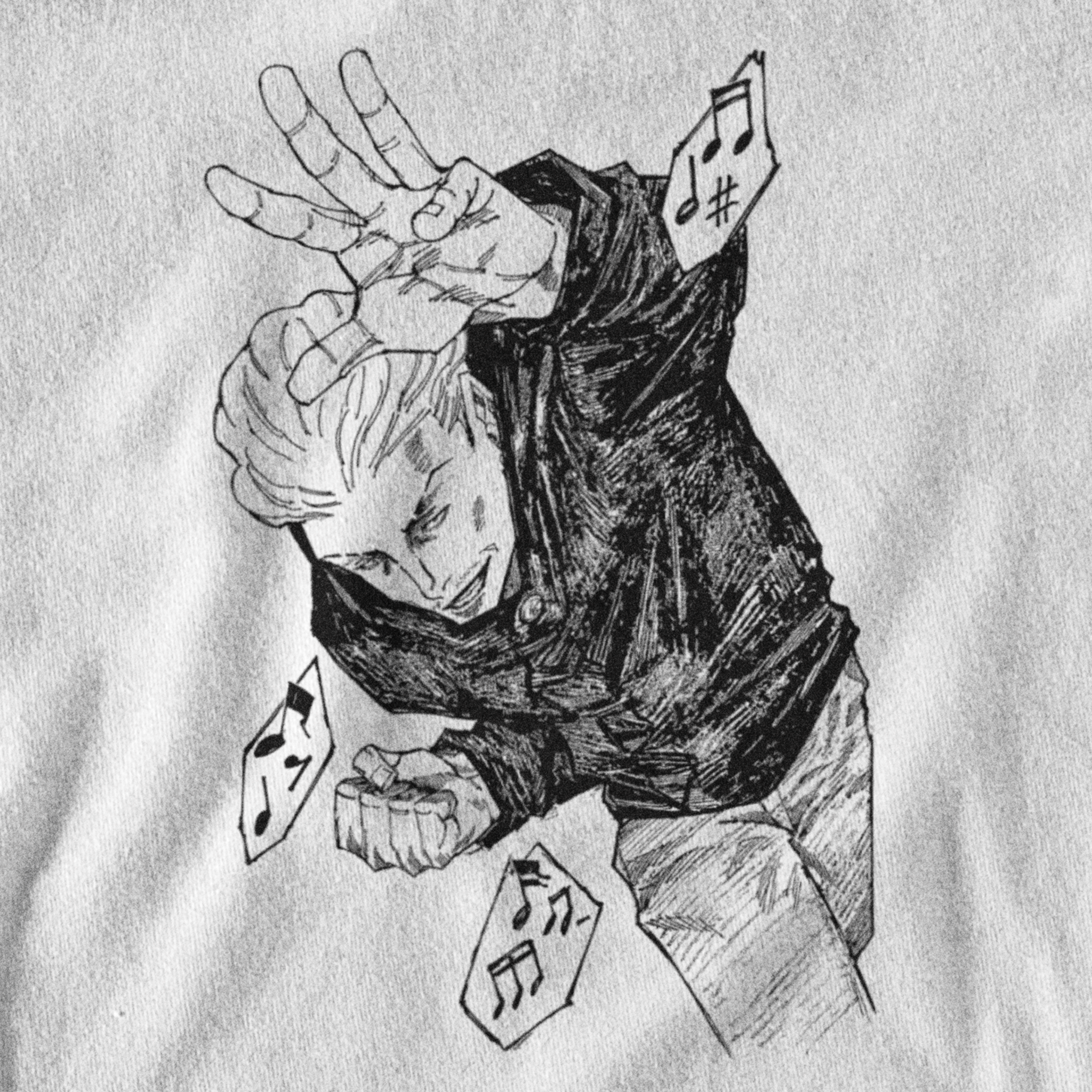 Onde a sorte encontra o êxtase da batalha. Esta estampa exclusiva em preto e branco captura Kinji Hakari em sua pose mais contagiante, cercado por notas musicais que remetem à trilha sonora de seu domínio.