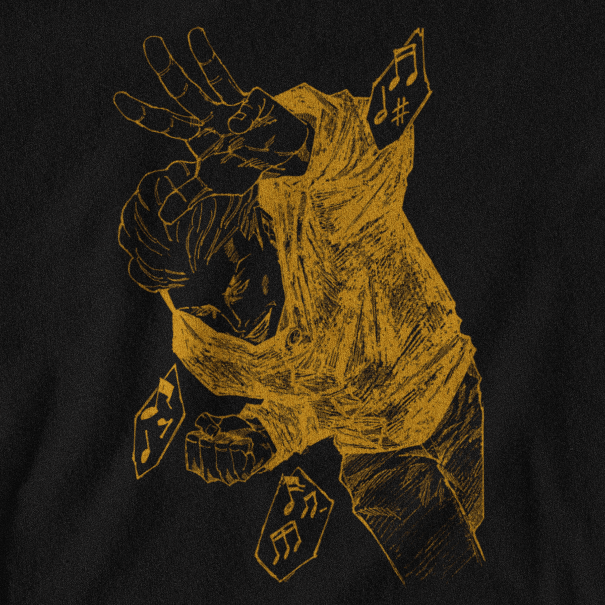 Onde a sorte encontra o êxtase da batalha. Esta estampa exclusiva em preto e branco captura Kinji Hakari em sua pose mais contagiante, cercado por notas musicais que remetem à trilha sonora de seu domínio.