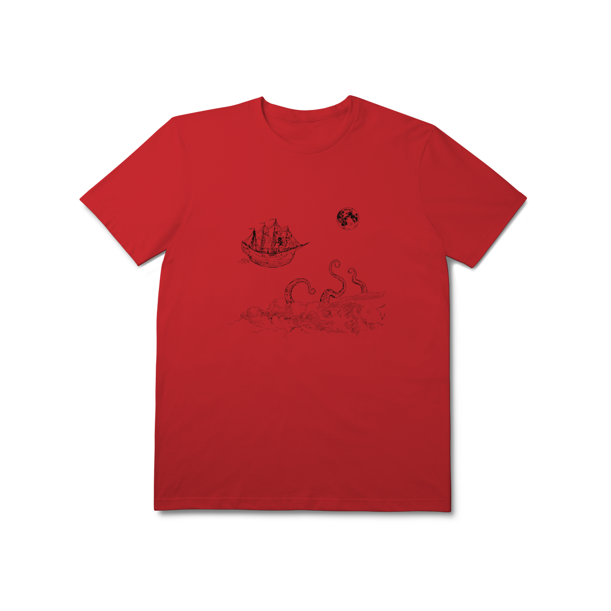 Onde o horizonte não tem limites e o perigo espreita entre as nuvens. Esta estampa exclusiva em preto e branco apresenta um cenário onírico: um imponente navio pirata navegando por um mar de névoa sob o brilho de uma lua cheia, enquanto tentáculos colossais de um Kraken celestial emergem das profundezas do céu. Com um traço detalhado que remete a gravuras clássicas, a peça é uma fusão perfeita de Piratecore e horror cósmico. Ideal para quem busca um visual underground que desafia a lógica e celebra a fantasia épica.