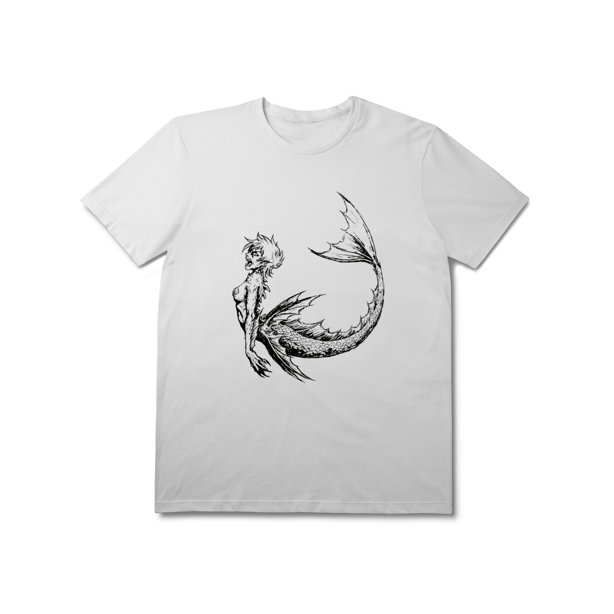 Esqueça os contos de fadas tradicionais. Esta estampa exclusiva em preto e branco apresenta uma visão visceral e surrealista das sereias: uma criatura das profundezas, feroz, com dentes afiados e garras prontas para o ataque. Com um traço estilo sketch detalhado que destaca cada escama e a musculatura da criatura, a peça evoca o lado obscuro da mitologia marinha. Ideal para quem busca um visual streetwear de alto impacto que une horror, fantasia e arte underground.