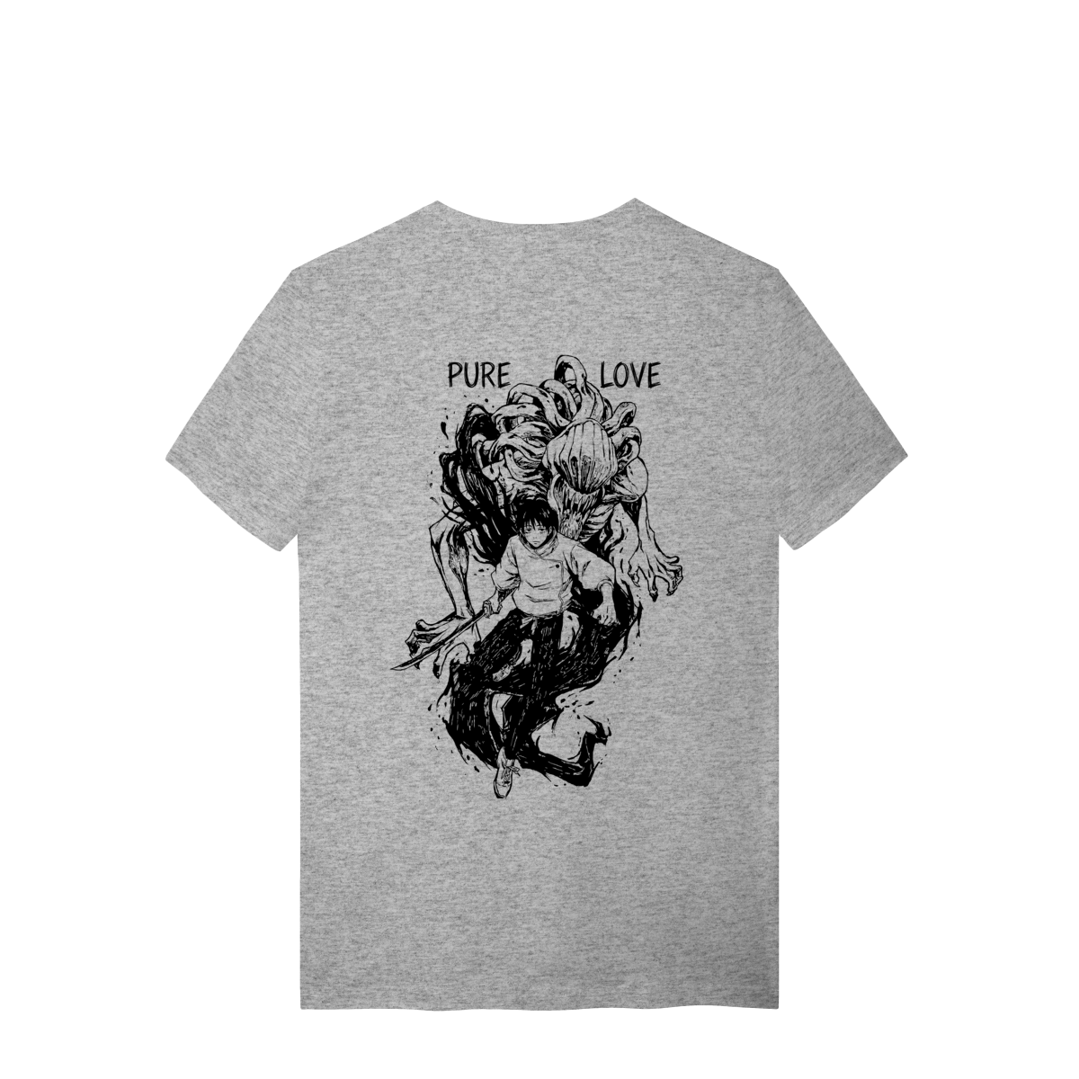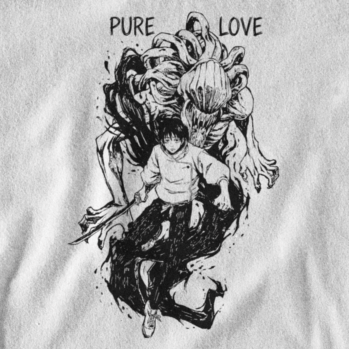 Onde o afeto se torna uma maldição incontrolável. Esta estampa exclusiva em preto e branco ilustra a simbiose entre Yuta Okkotsu e a manifestação espiritual de Rika Orimoto.